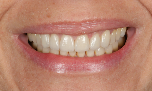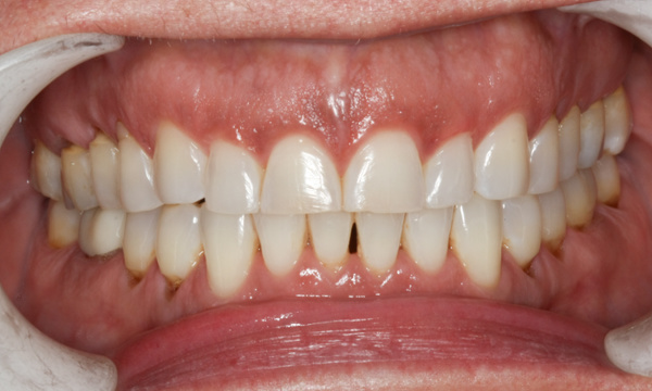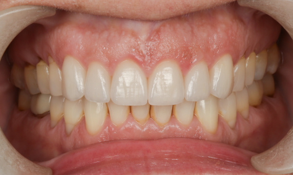 Gummy smile correction with crown lengthening surgery, followed by porcelain veneers to achieve a natural and aesthetic smile.